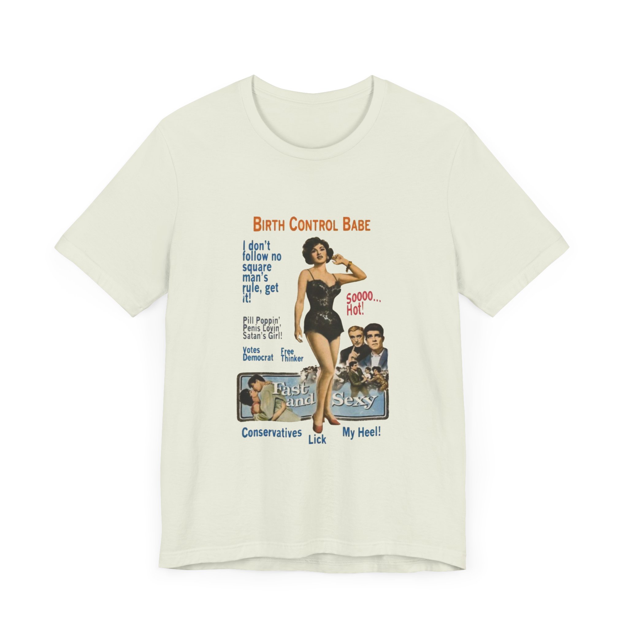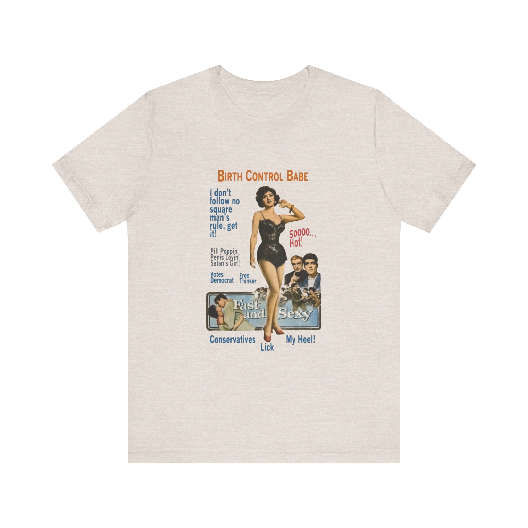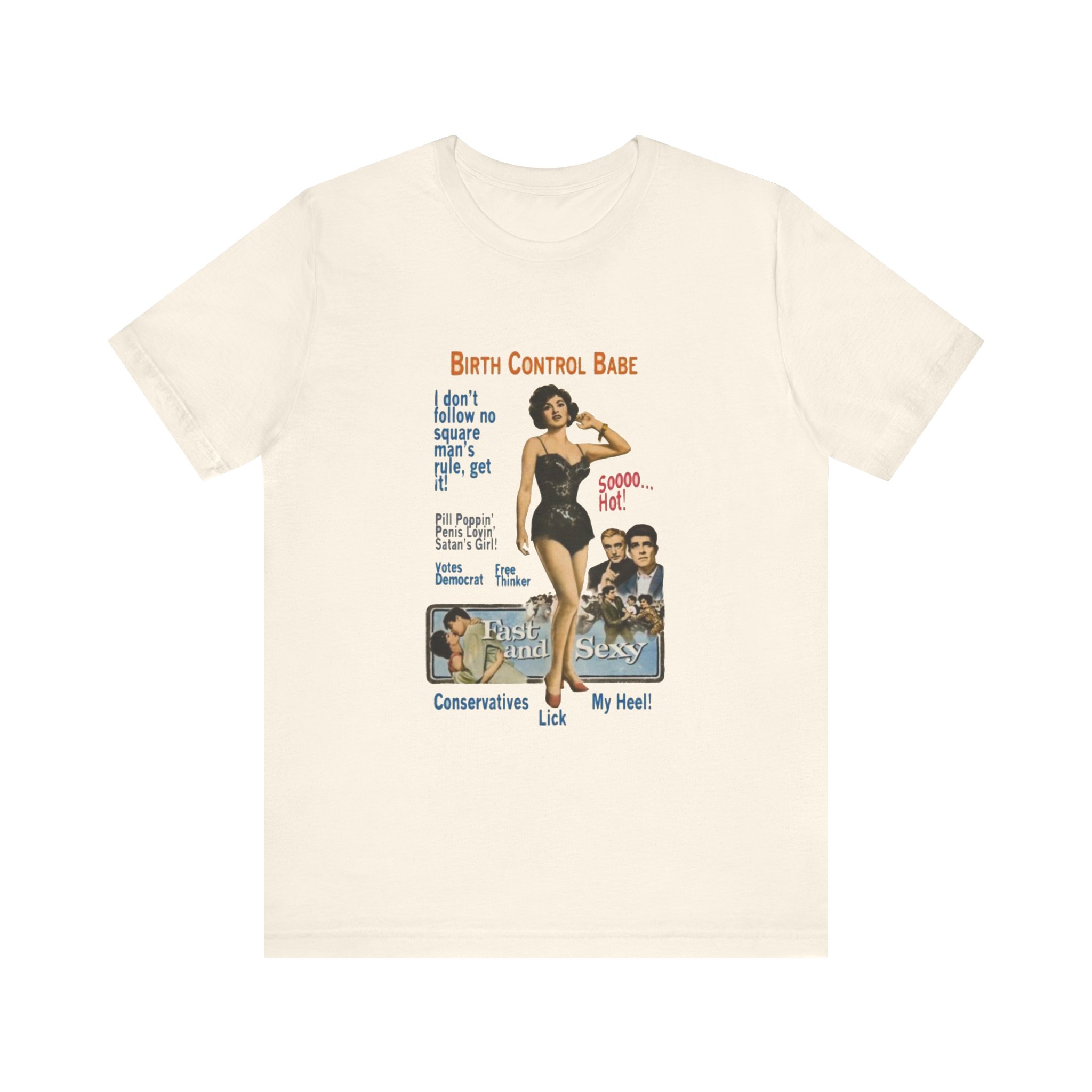 The Birth Control Babe shirt for feminists and other freethinkers. This classic unisex jersey short sleeve tee is not just a piece of clothing; it’s a proclamation of freedom and feminism. Inspired by 60s graphics, it features the daring “Birth Control Babe,” a pinup girl icon who defies conservative uptight religiously-influenced nonsense with phrases like “penis lovin’ pill popping satan’s girl” and “conservatives lick my heel.” Perfect for those who proudly identify as a Democrat or a free thinker, this shirt is a must-have for anyone who supports feminism and is disgusted by the crazed religious extremists whose psychopathic need to control women has been celebrated and encouraged by the United State’s temporary and polluted Supreme Court’s decision to repeal Roe v. Wade, enslaving hundreds of thousands of women into unpaid labor against their will and thousands more dead at the hands of a medical procedure that is statistically safer than childbearing and delivery.