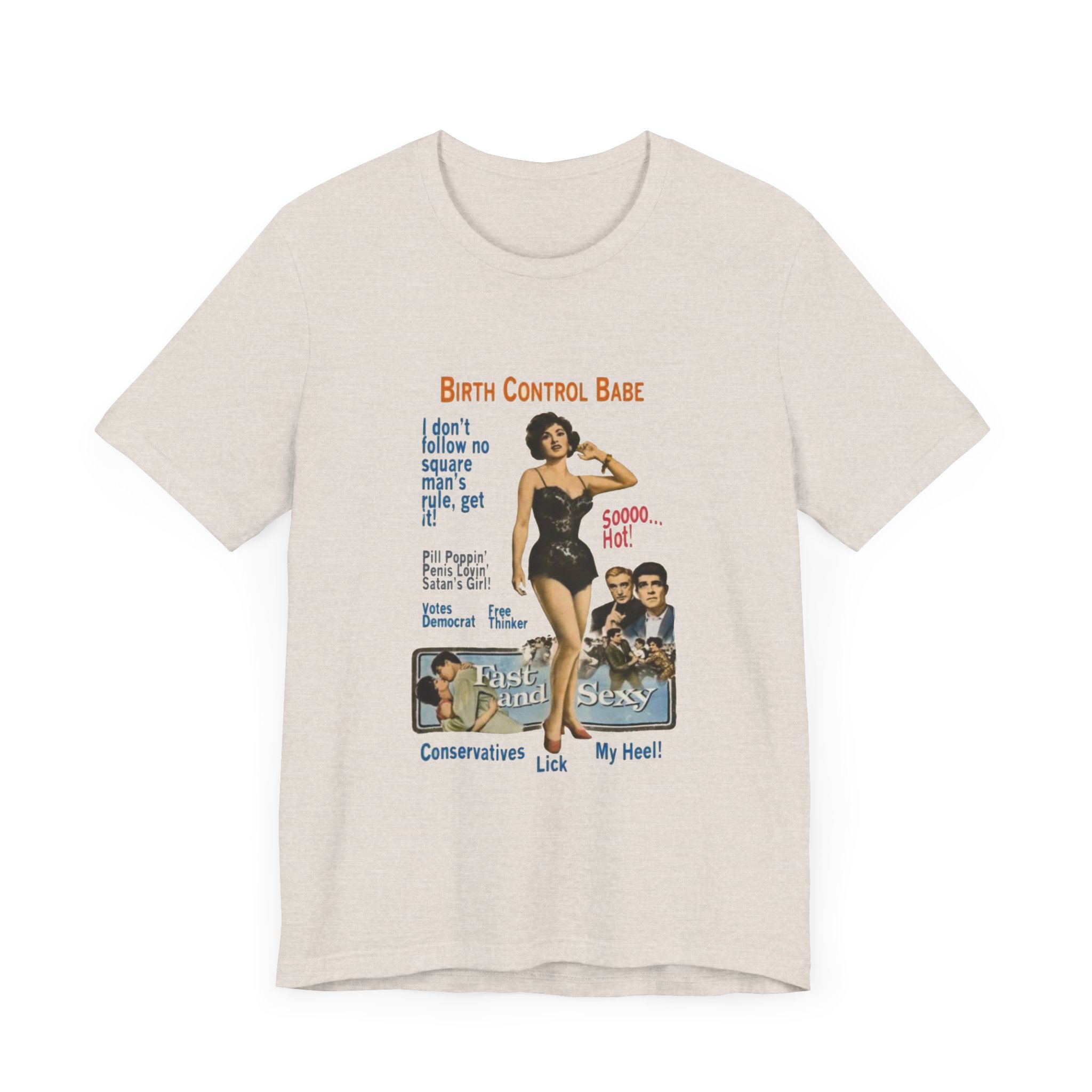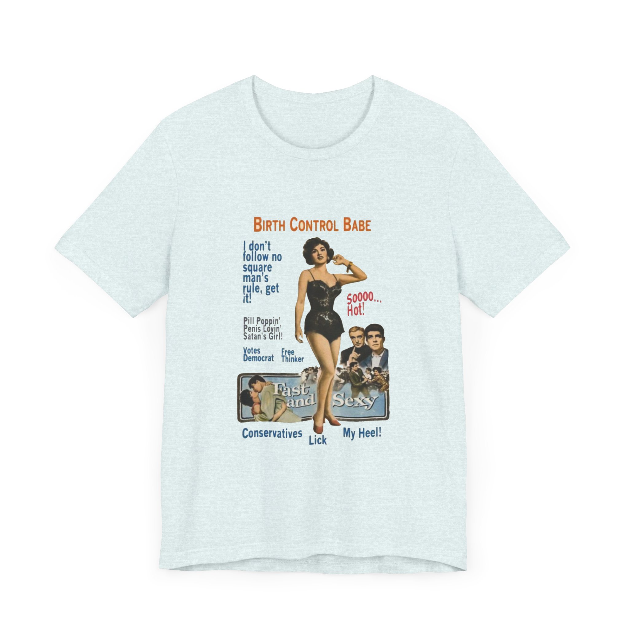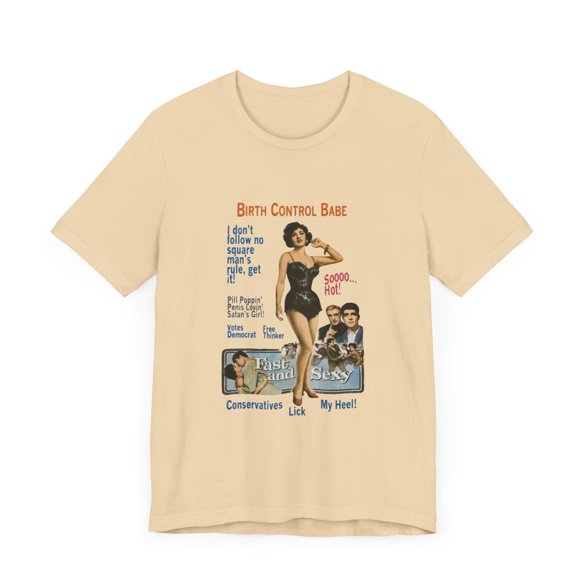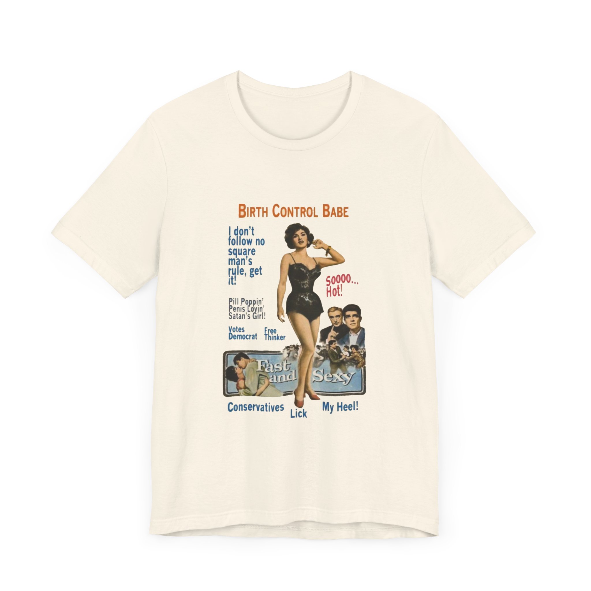 The Birth Control Babe shirt for feminists and other freethinkers. This classic unisex jersey short sleeve tee is not just a piece of clothing; it’s a proclamation of freedom and feminism. Inspired by 60s graphics, it features the daring “Birth Control Babe,” a pinup girl icon who defies conservative uptight religiously-influenced nonsense with phrases like “penis lovin’ pill popping satan’s girl” and “conservatives lick my heel.” Perfect for those who proudly identify as a Democrat or a free thinker, this shirt is a must-have for anyone who supports feminism and is disgusted by the crazed religious extremists whose psychopathic need to control women has been celebrated and encouraged by the United State’s temporary and polluted Supreme Court’s decision to repeal Roe v. Wade, enslaving hundreds of thousands of women into unpaid labor against their will and thousands more dead at the hands of a medical procedure that is statistically safer than childbearing and delivery.