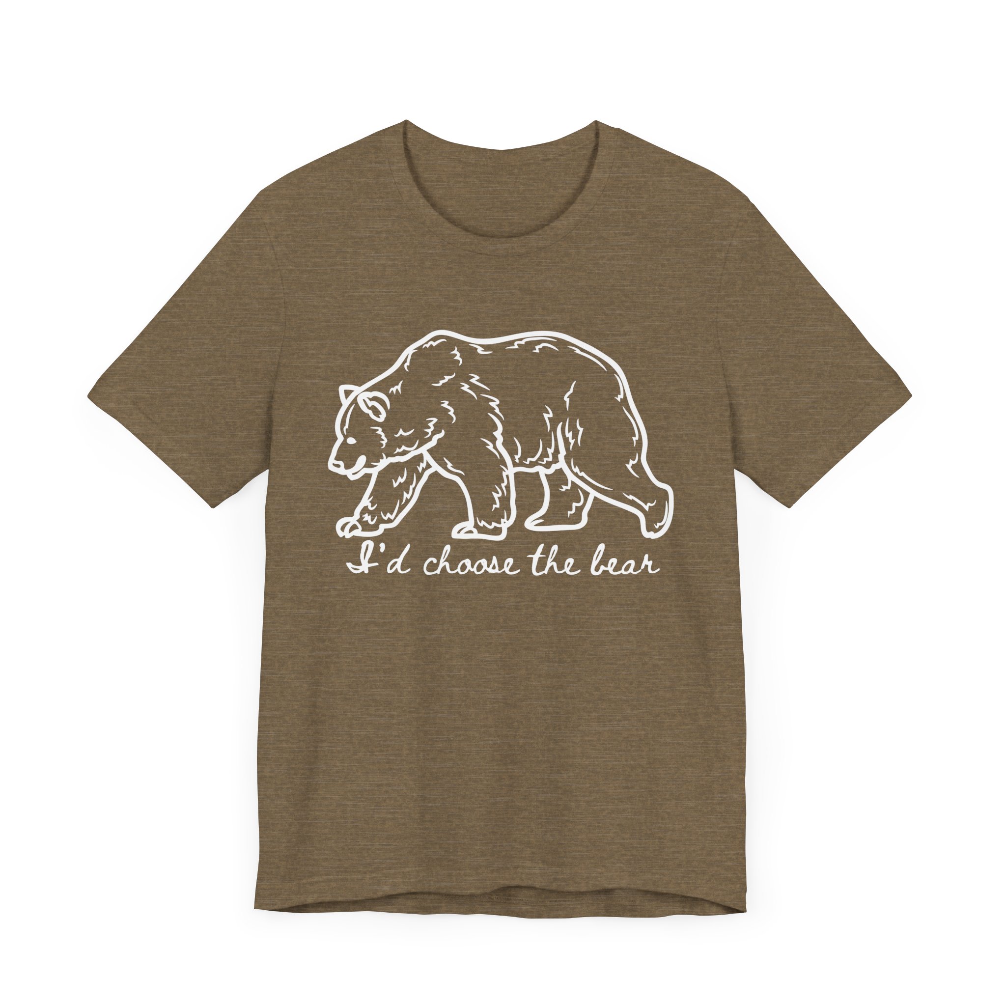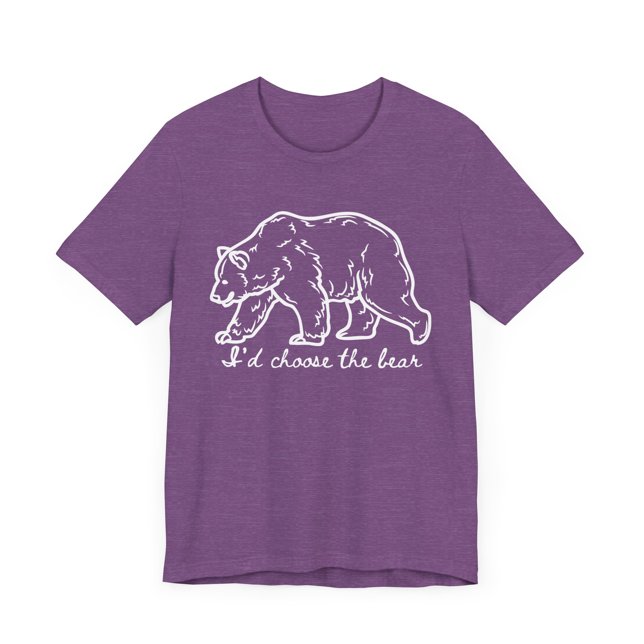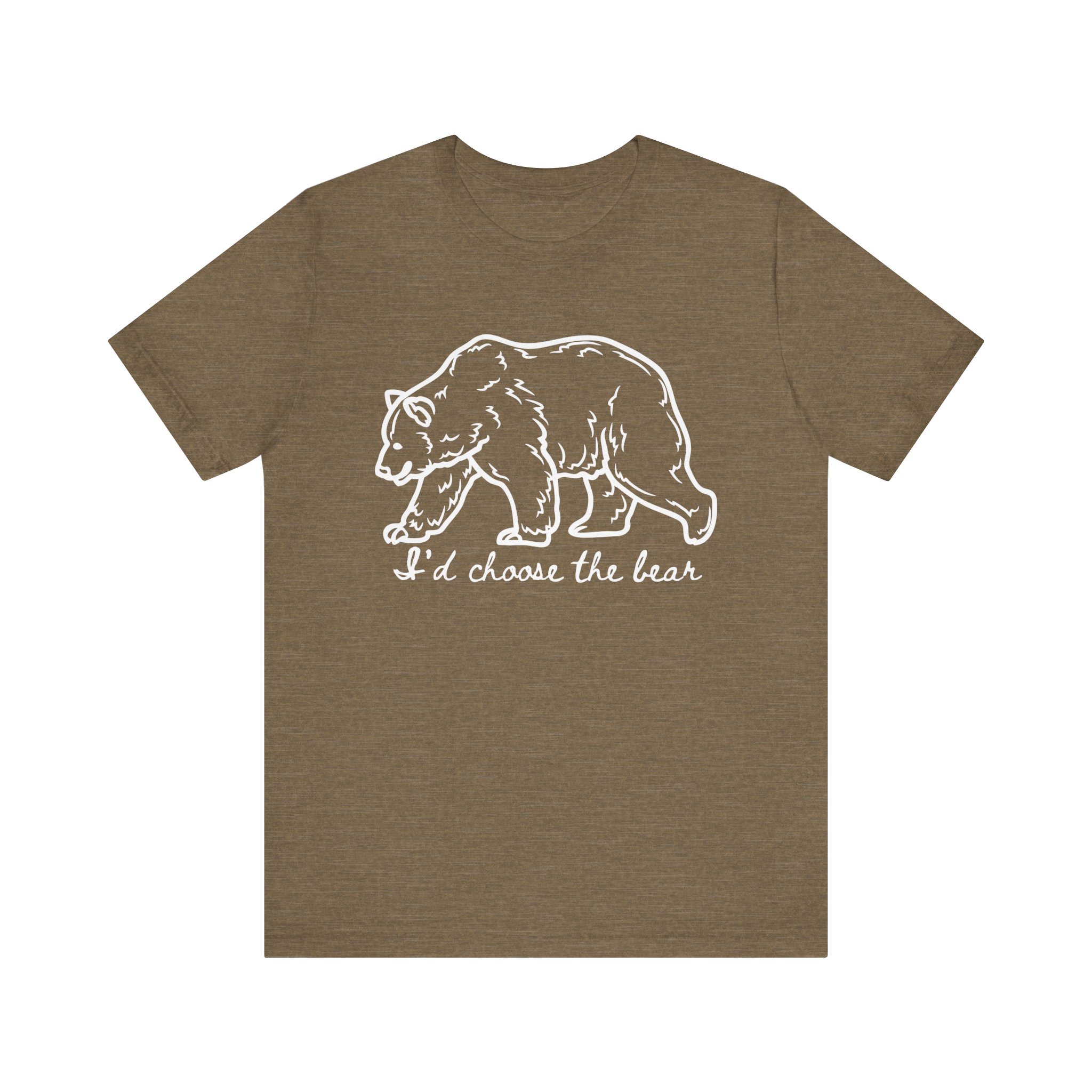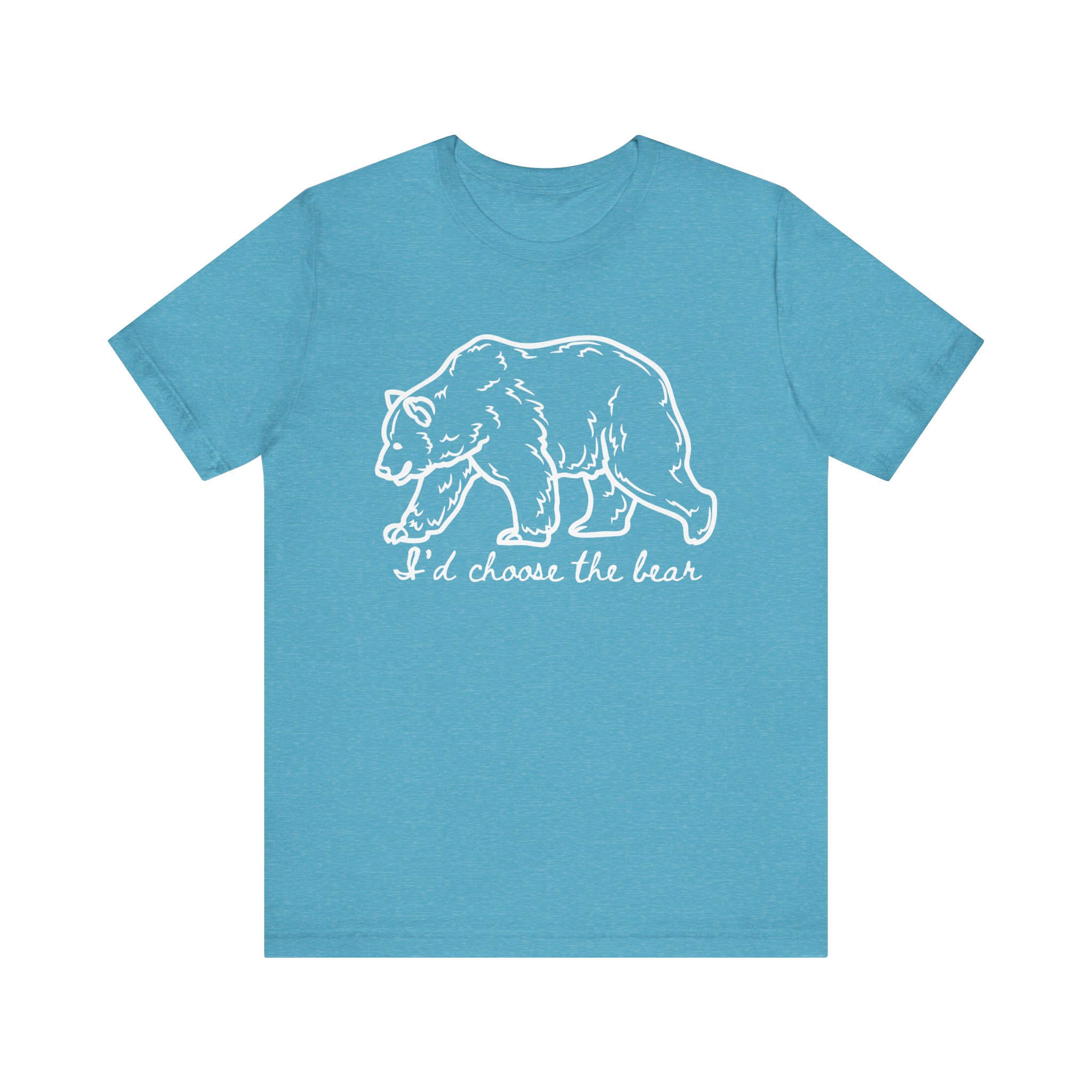 Hypothetically speaking, you’re hiking along in the mountains when the path splits ahead of you. In one direction there’s a human male and in the other direction there’s a bear of unknown gender. Which path do you take? This classic unisex jersey short sleeve tee fits like a well-loved favorite and comes slightly distressed (but […]