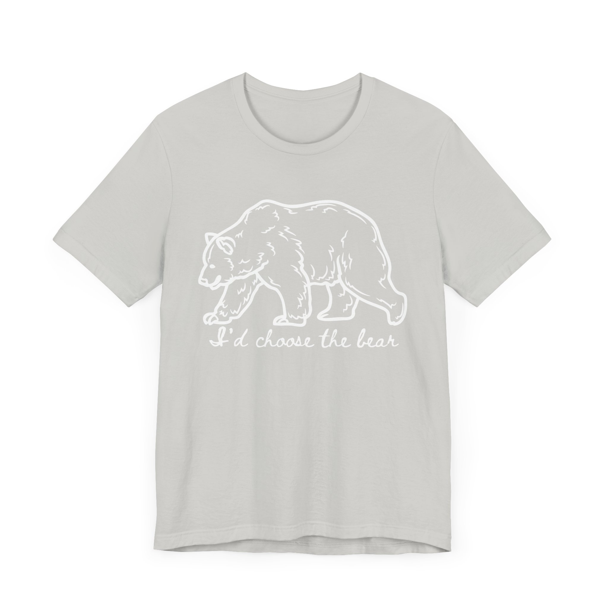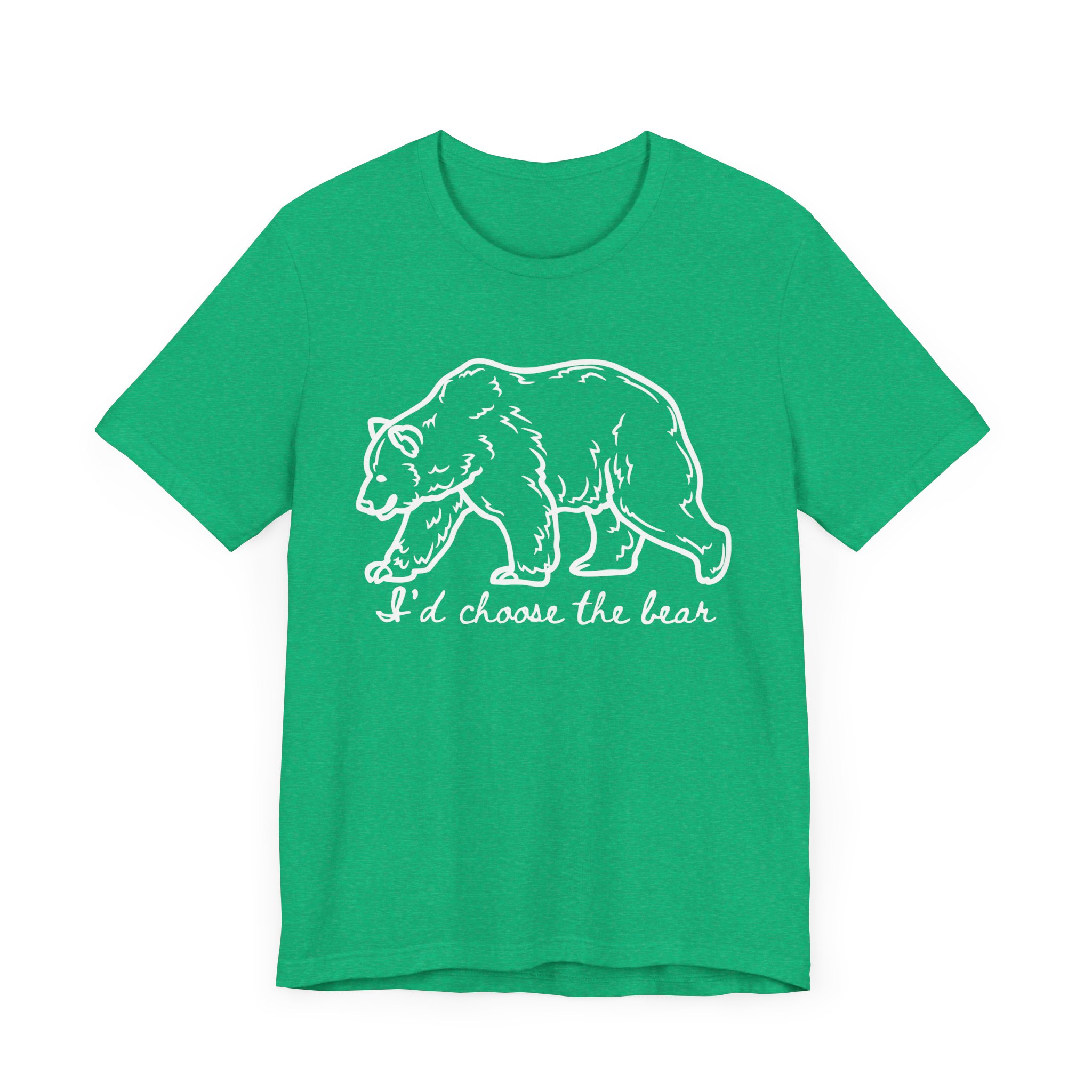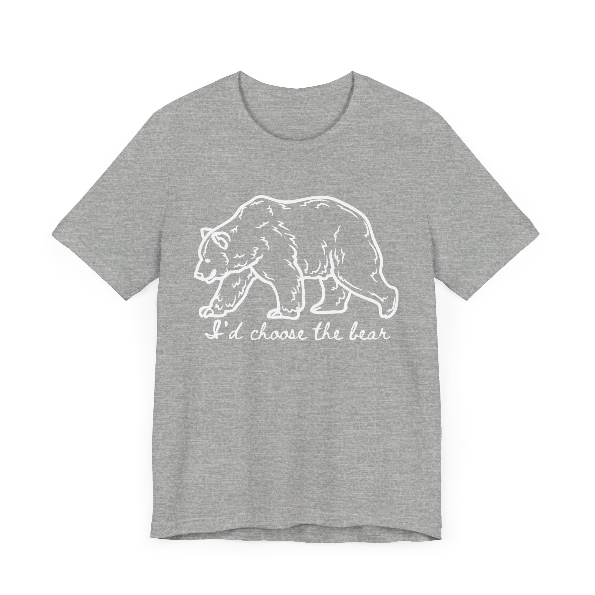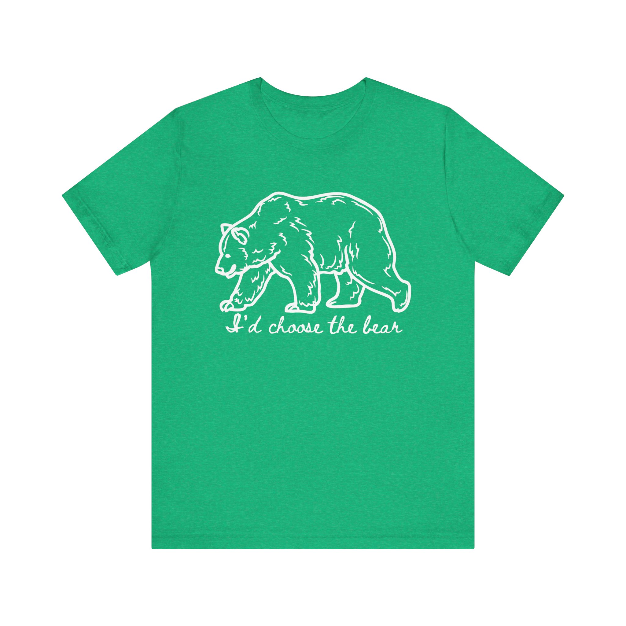 Hypothetically speaking, you’re hiking along in the mountains when the path splits ahead of you. In one direction there’s a human male and in the other direction there’s a bear of unknown gender. Which path do you take? This classic unisex jersey short sleeve tee fits like a well-loved favorite and comes slightly distressed (but […]